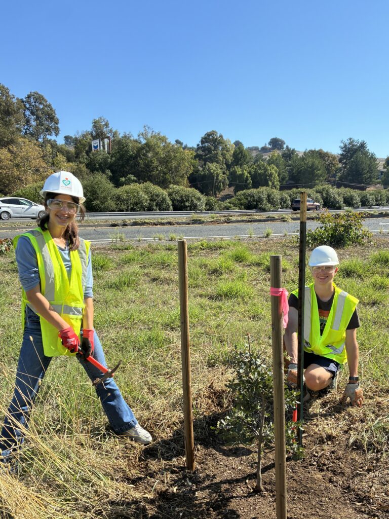 Key club volunteers stand by freshly mulched Valley oak tree sapling.