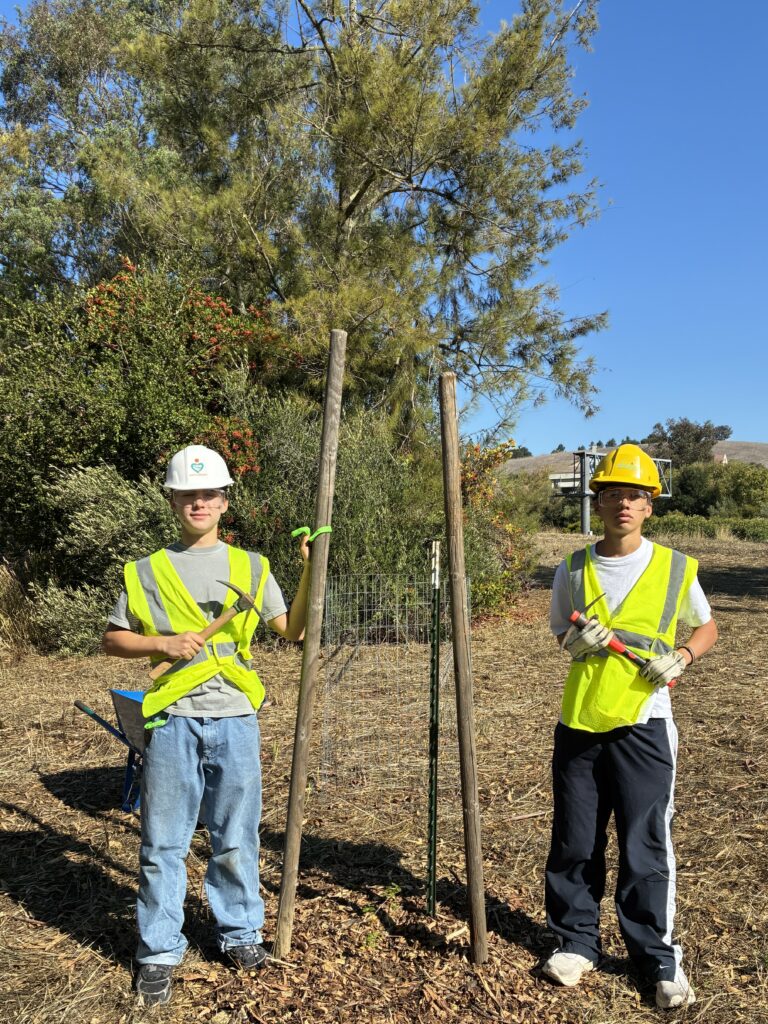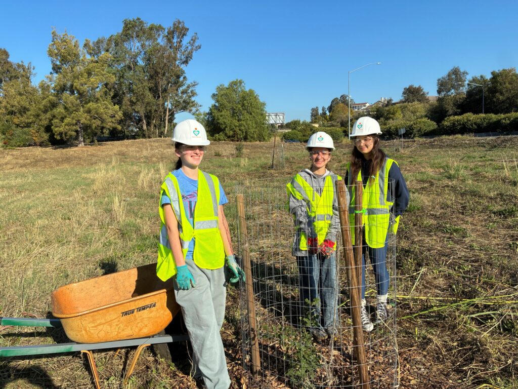 Key club volunteers stand by freshly mulched Valley oak tree sapling.